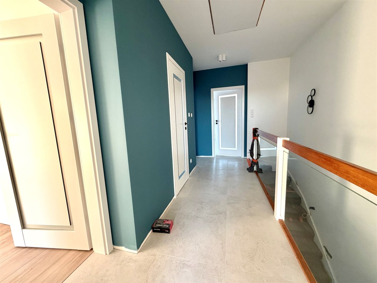 Piętro : 4 sypialnie ( podłogi panele), łazienka z kabina i wanną ( glazura i terakota)