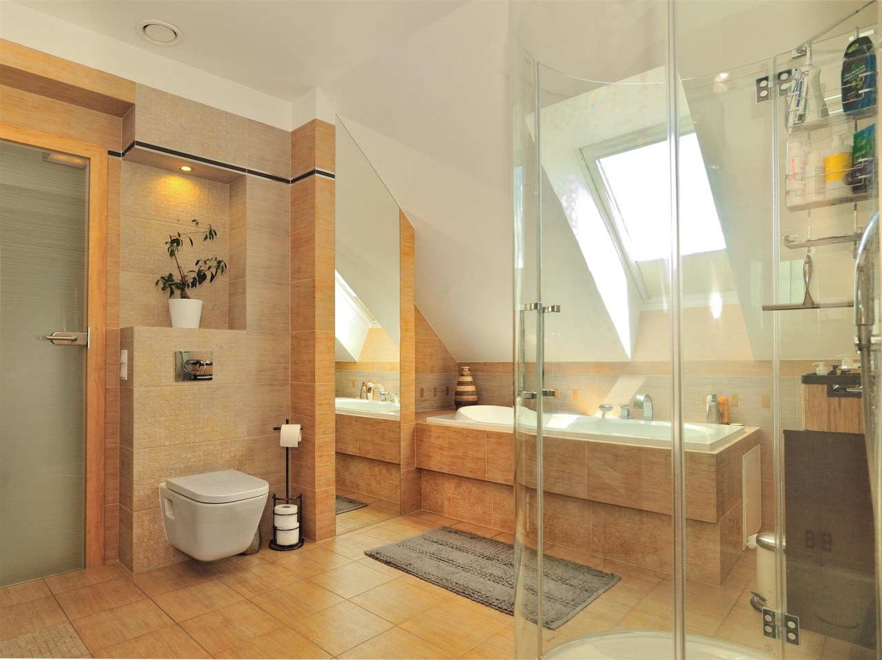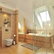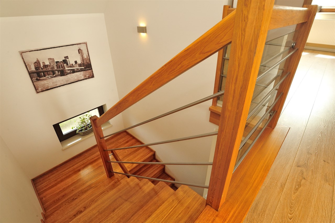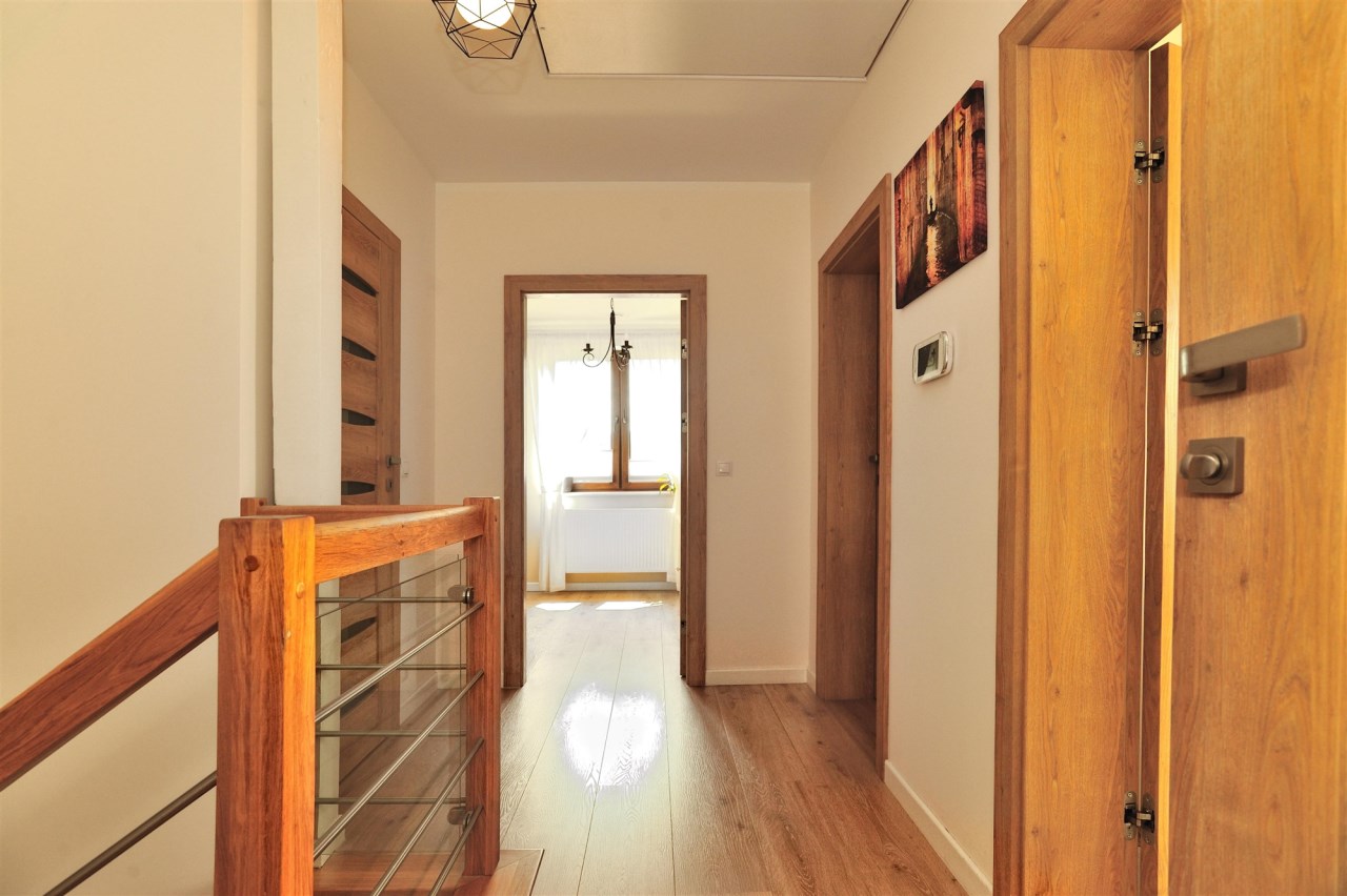 Na górze mamy trzy pokoje: w tym sypialnia z garderobą, duża łazienka z prysznicem oraz wanną,