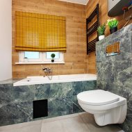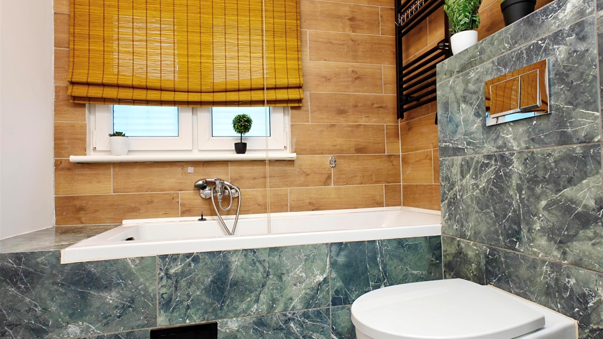 nowo wyremontowana łazienka z wanną (bojler elektryczny, miejsce na pralkę, grzejnik).