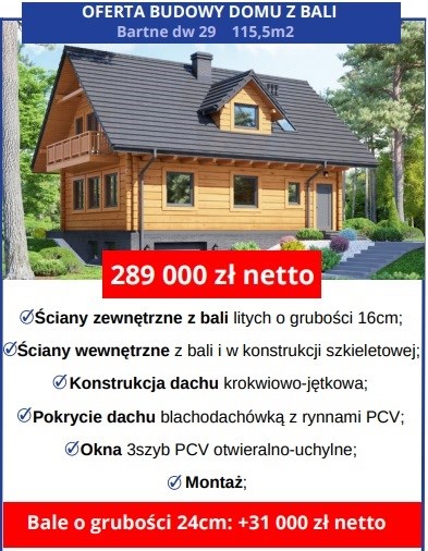 Przykładowy dom z bali w cenie 289000zł netto obejmuje konstrukcję z bali 16cm (możliwa konstrukcja z bali 24c, za dopłatą 31000zł), ściany wewnętrzne z bali i konstrukcji szkieletowej, dach konstrukcji krokwiowo jętkowej, pokrycie dachu blachodachówką z rynnami PCV, okna 3 szybowe PCV.
