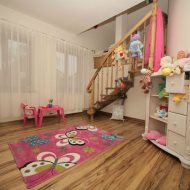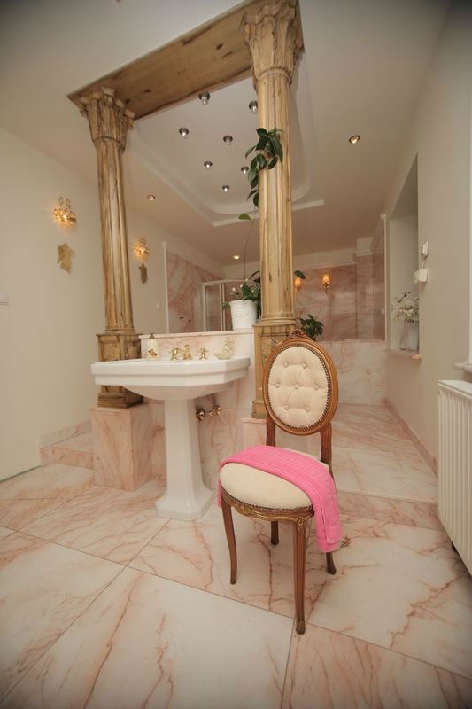Na pierwsze piętro prowadzi szeroka, wygodna, przepięknie zaprojektowana klatka schodowa, z wykonanymi przez metaloplastyka poręczami, schody wykonane z egzotycznego drewna frake (afrykańskiego drewna o bardzo oryginalnym ubarwieniu). Na pietrze znajdują: się łazienka cała wyłożona różowym marmurem (sprowadzonym z Portugalii na specjalne zmówienie) z wanną, bidetem, toaletą, umywalką i pozłacaną armaturą, ogrzewaniem podłogowym, pokój dziecięcy i dwie sypialnie oraz przestronny hol. Podłogi na piętrze w pokojach i holu z z afrykańskiego drewna frake, z tego poziomu jest bezpośrednie wyjście na duży taras o powierzchni 40 m2 przykryty winoroślą i osłonięty od ulicy ścianką. Poddasze użytkowe to przestronne otwarte studio z łazienką wyposażoną w kabinę natryskową, w łazience ogrzewanie podłogowe.