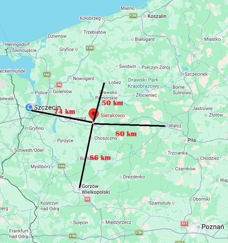 Działka nr 28/8 w Sierakowie o powierzchni 5 149 m² z zabudowaniami, w skład których wchodzą trzy lokale, w tym jeden mieszkalny, oraz budynek gospodarczy o powierzchni 120 m². Budynek mieszkalny z 1948 roku ma powierzchnię użytkową 42,86 m² i składa się z przedsionka, przedpokoju, łazienki, pokoju z aneksem kuchennym oraz drugiego pokoju. Nieruchomość położona w wiejskiej okolicy, w otoczeniu pól oraz zabudowy jednorodzinnej i siedliskowej, z dojazdem drogą lokalną. Odległości: Dobrzany – 7 km, Stargard – 26 km, Szczecin – 61 km, Gorzów Wielkopolski – 87 km.