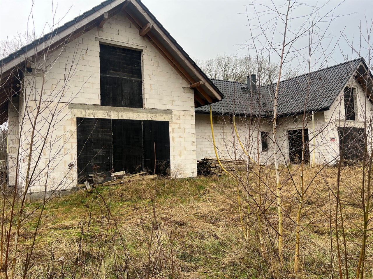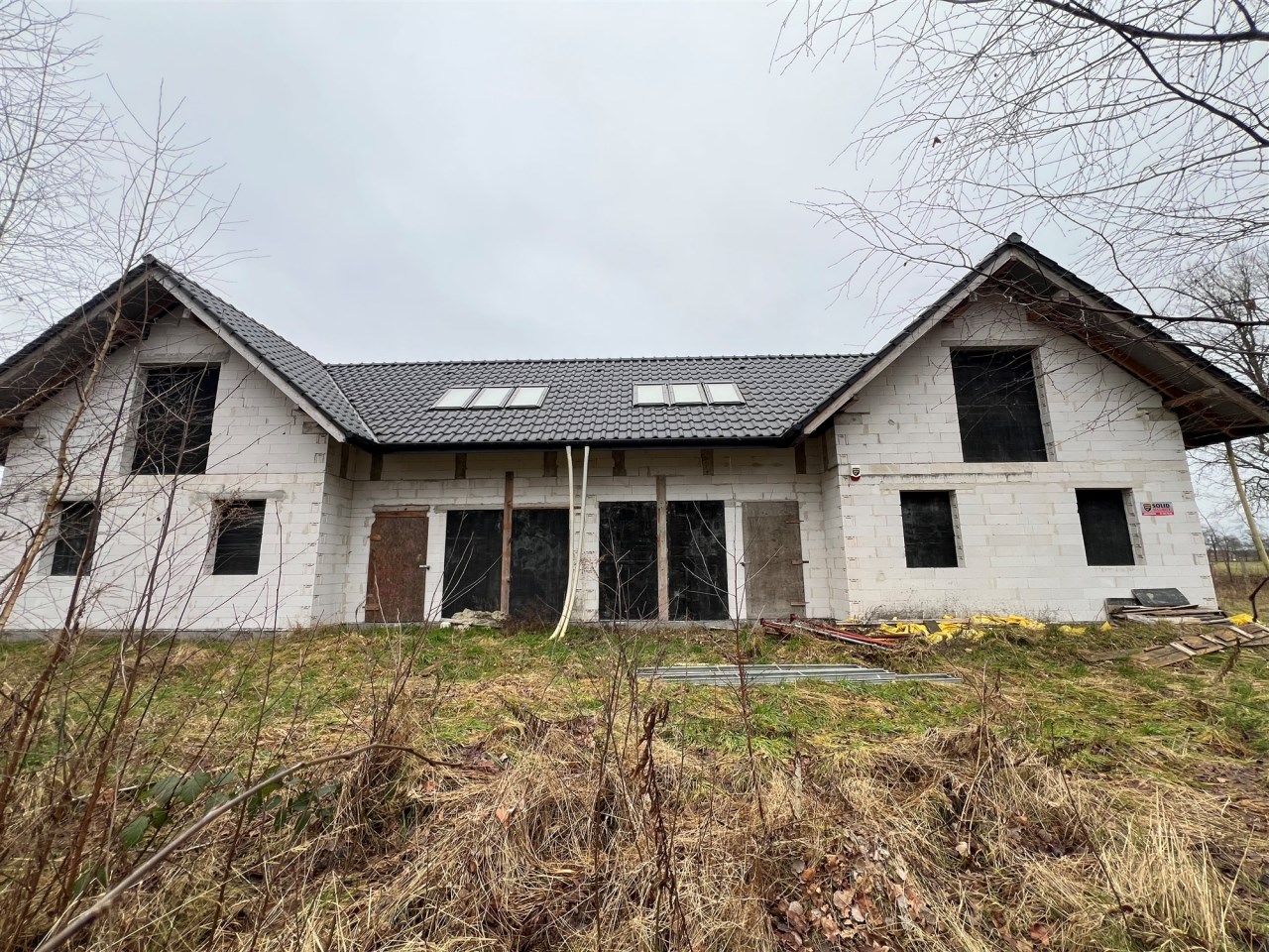 Budynek sprzedawany w stanie surowym otwartym, bez ścianek działowych w środku, aby nowy właściciel miał możliwość zmian i rozstawu pomieszczeń. Dach pokryty dachówką ceramiczną. Dojazd do działki drogą gruntową.