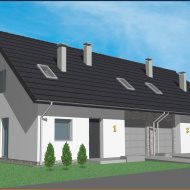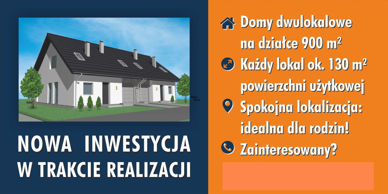 Dom jednorodzinny dwulokalowy na na działce 900 m2 , dla każdej połowy po 450 m2, każda połówka domu to ok.130m2 powierzchni użytkowej. W projekcie podwójna ściana z dylatacją między sąsiadami co jest wymagane w zabudowie bliźniaczej a czego nikt z deweloperów nie stosuje w przypadku budynków dwulokalowych. Dostępne media: prąd, woda z wodociągu miejskiego ( w trakcie budowy), gaz lub pompa ciepła, szambo. Budynki w stanie surowym zamkniętym z elewacją i mediami doprowadzonymi do budynku . Klient na tym etapie ma możliwość zastanowienia się nad rodzajem ogrzewania, jak również decyduje o wszystkim co będzie robił wewnątrz budynku przy jego wykańczaniu. Budynki do wydania w III kwartale 2025 roku