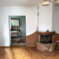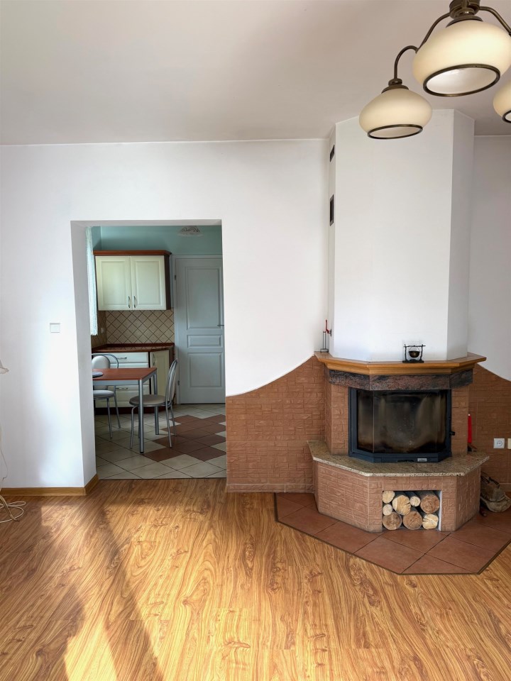 Przestronny salon z kominkiem i wyjściem na taras oraz ogród