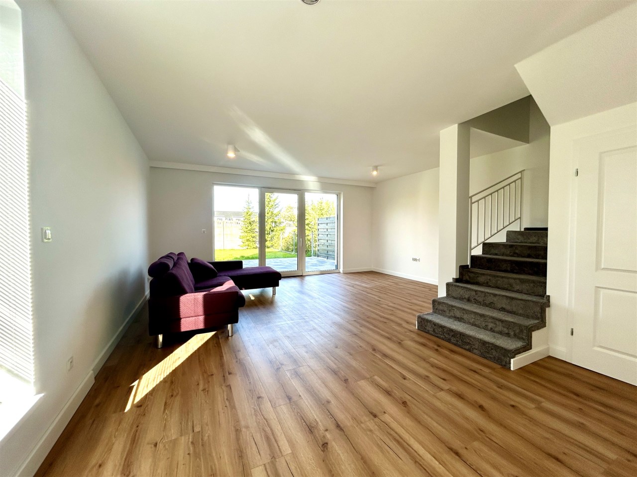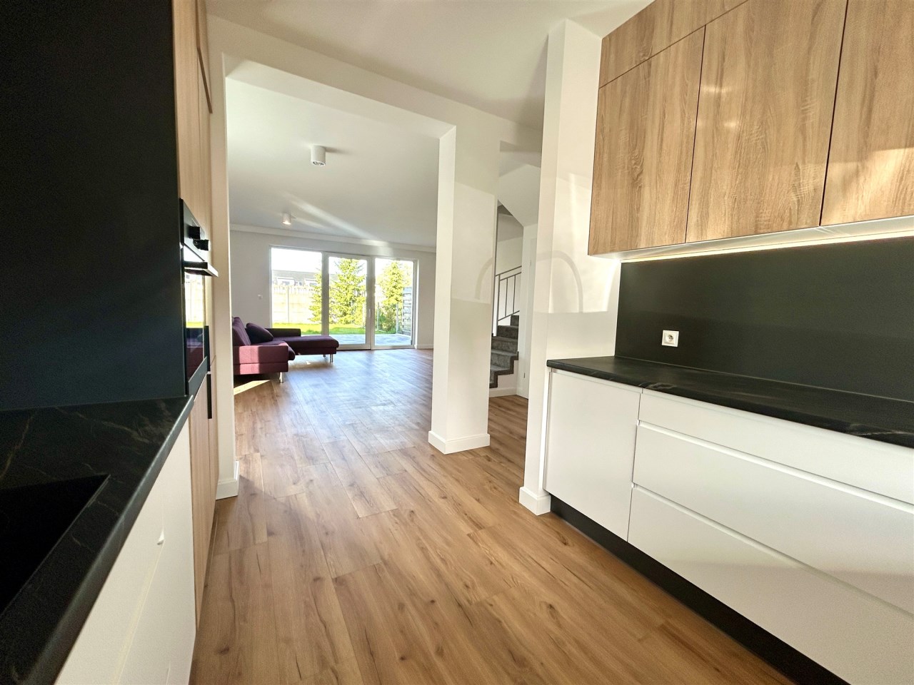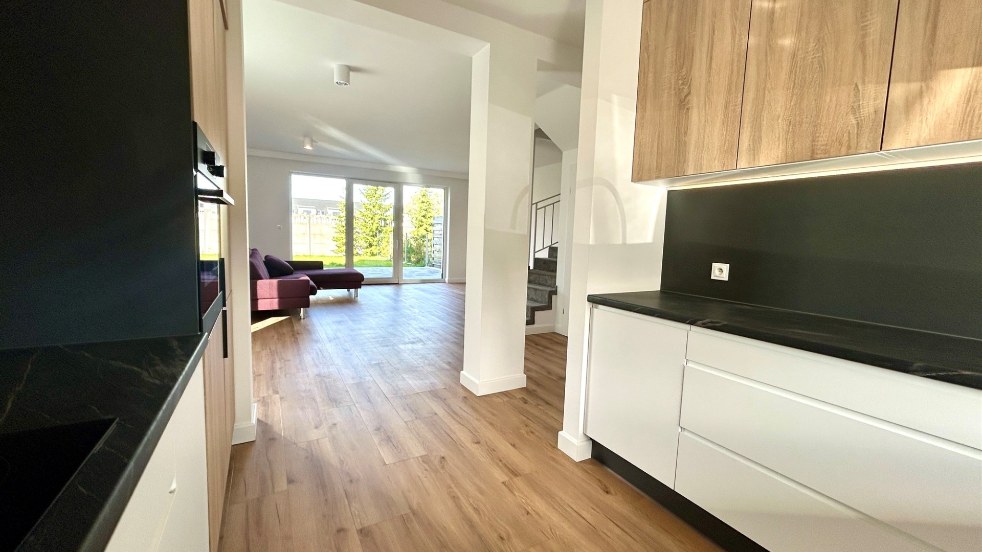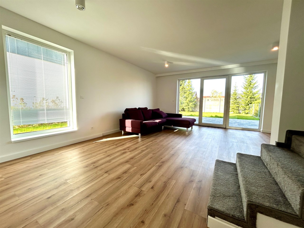 Dom wykończony w jasnych, nowoczesnych barwach, z dużymi przeszkleniami i ogrzewaniem podłogowym w całym budynku.