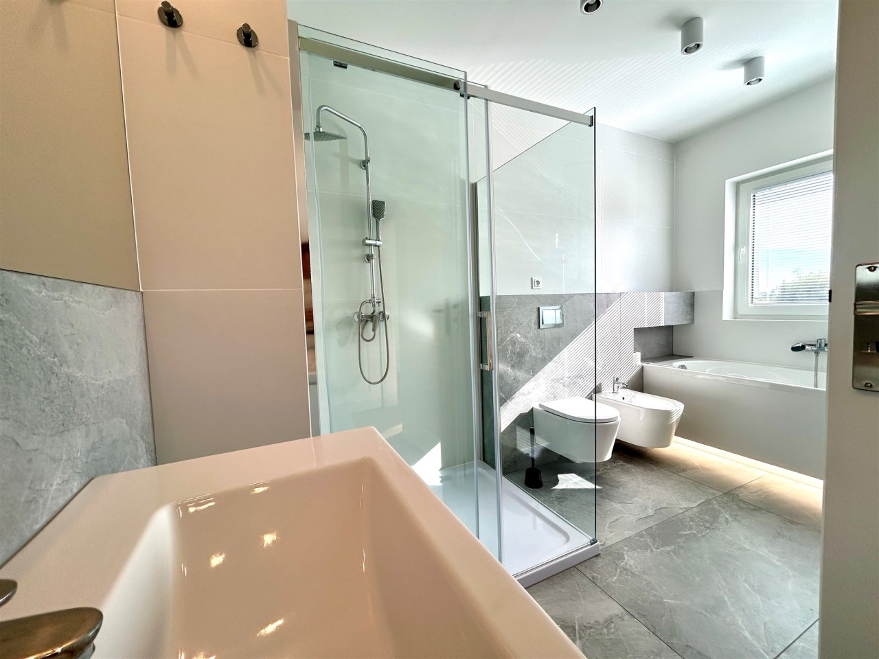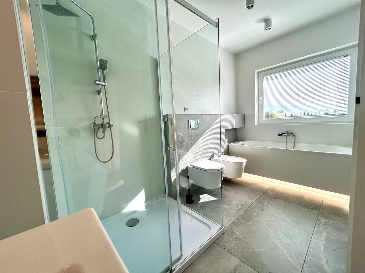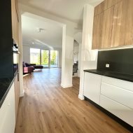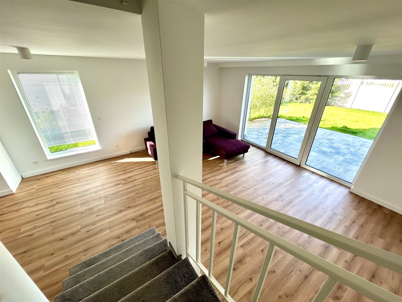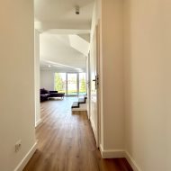 Dom wykończony w jasnych, nowoczesnych barwach, z dużymi przeszkleniami i ogrzewaniem podłogowym w całym budynku.