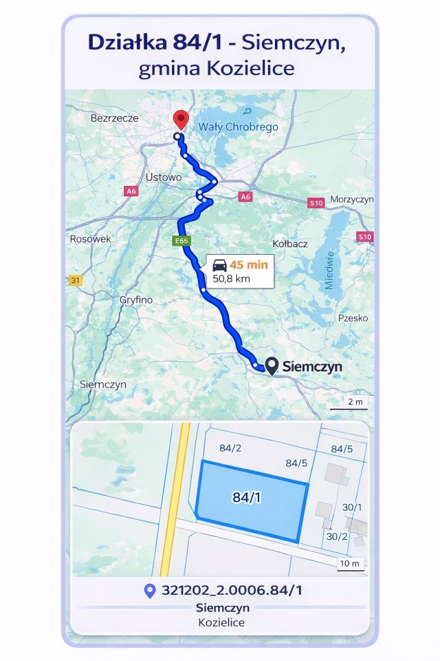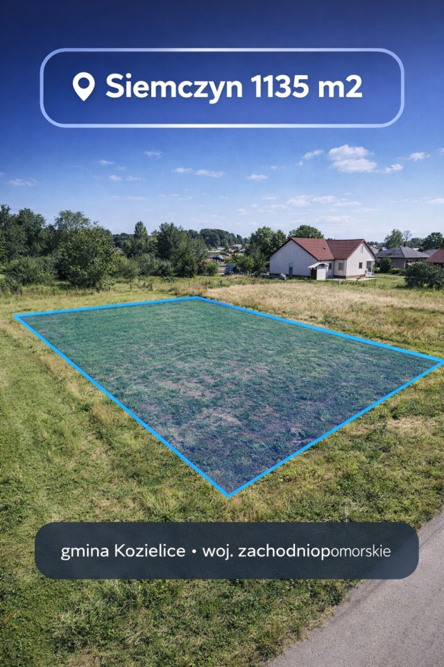 Na sprzedaż działka niezabudowana o powierzchni 1134 m², położona w miejscowości Siemczyn, zaledwie 12 minut od Pyrzyc. Nieruchomość usytuowana jest w centrum wsi, na terenie zurbanizowanym, w otoczeniu zabudowy mieszkalnej, co zapewnia komfort oraz poczucie bezpieczeństwa przyszłym właścicielom. W bezpośrednim sąsiedztwie znajdują się najważniejsze punkty infrastruktury lokalnej, takie jak świetlica wiejska, boisko piłkarskie oraz sklep spożywczo-przemysłowy, co czyni lokalizację wygodną do codziennego życia. Działka ma regularny, prostokątny kształt oraz płaskie ukształtowanie terenu, co znacząco ułatwia proces projektowania i realizacji zabudowy. Dojazd do nieruchomości odbywa się bezpośrednio z drogi asfaltowej, a media dostępne są w drodze, co stanowi duży atut inwestycyjny i obniża koszty przygotowania do budowy. To idealna propozycja pod zabudowę mieszkaniową jednorodzinną dla osób poszukujących spokojnego miejsca do życia, z jednoczesnym szybkim i wygodnym dojazdem do Pyrzyc oraz innych okolicznych miejscowości Pomorza Zachodniego.
