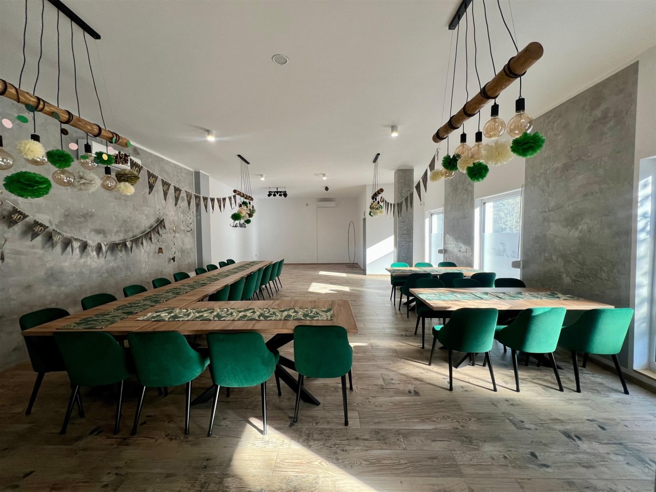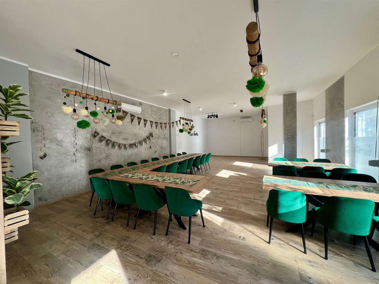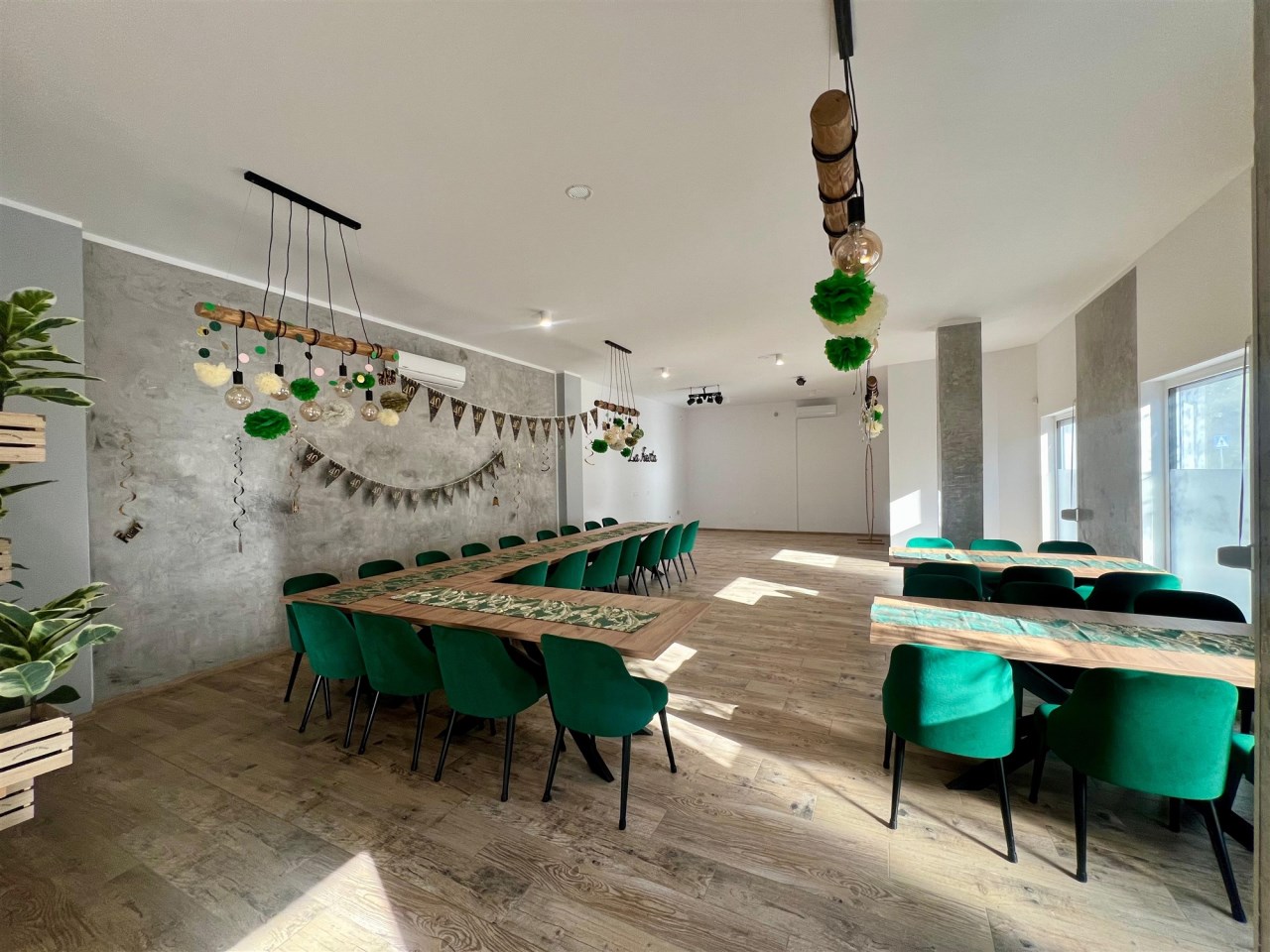 •    Sala główna ok. 104 m² – jasna i przestronna, z czterema dużymi oknami (205×137 cm) wyposażonymi w żaluzje antywłamaniowe,