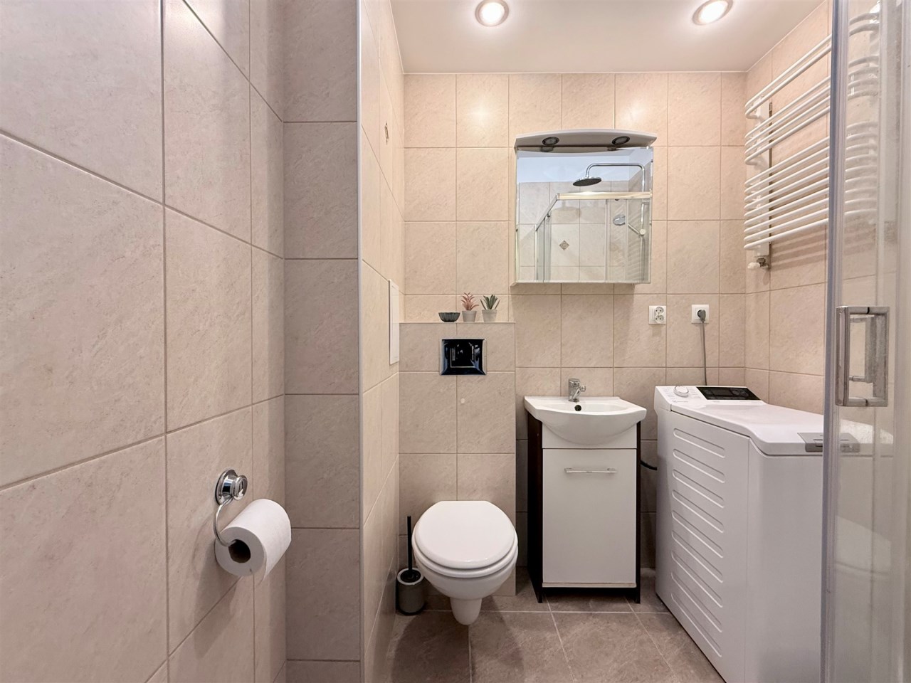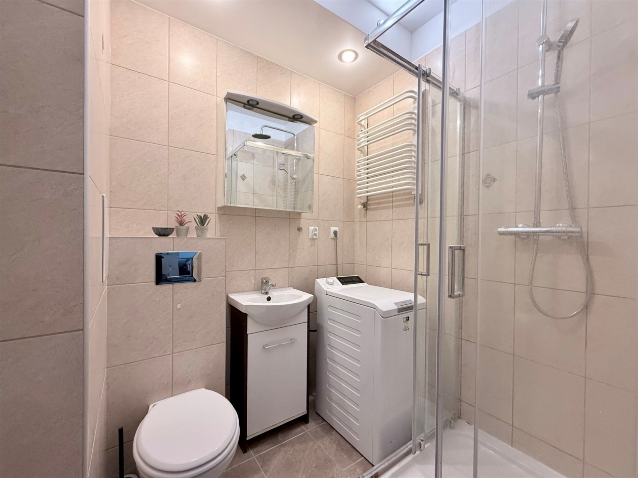 łazienka z kabiną prysznicową, dodatkowo wyposażona w elektryczne ogrzewanie podłogowe
