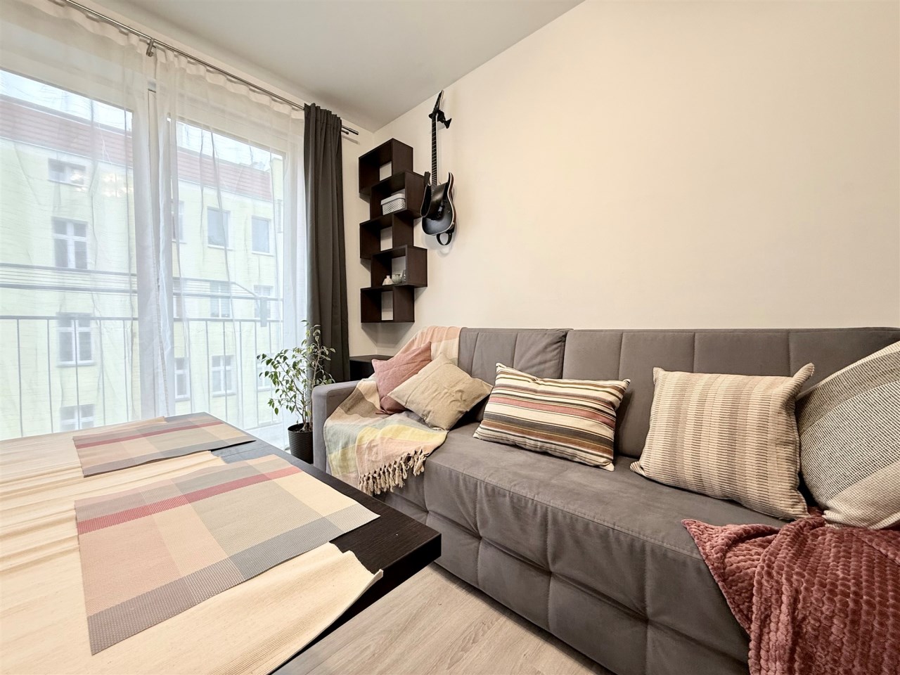 przestronny salon z kratką balkonową