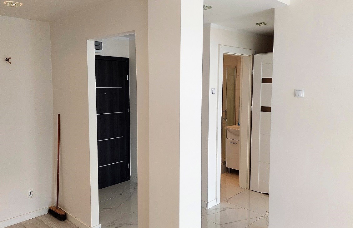 W pokojach i przedpokoju ściany gipsowane oraz malowane. Okna PCV z wystawą na południe. Podłogi w pokojach z paneli, w łazience i holu z terakoty. Na wyposażeniu pozostają w kuchni meble oraz płyta indukcyjna. Przyłącze do pralki w aneksie kuchennym.Łazienka w modnych płytkach, z kabiną prysznicową oraz kompaktem WC w zabudowie.