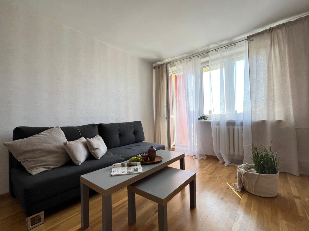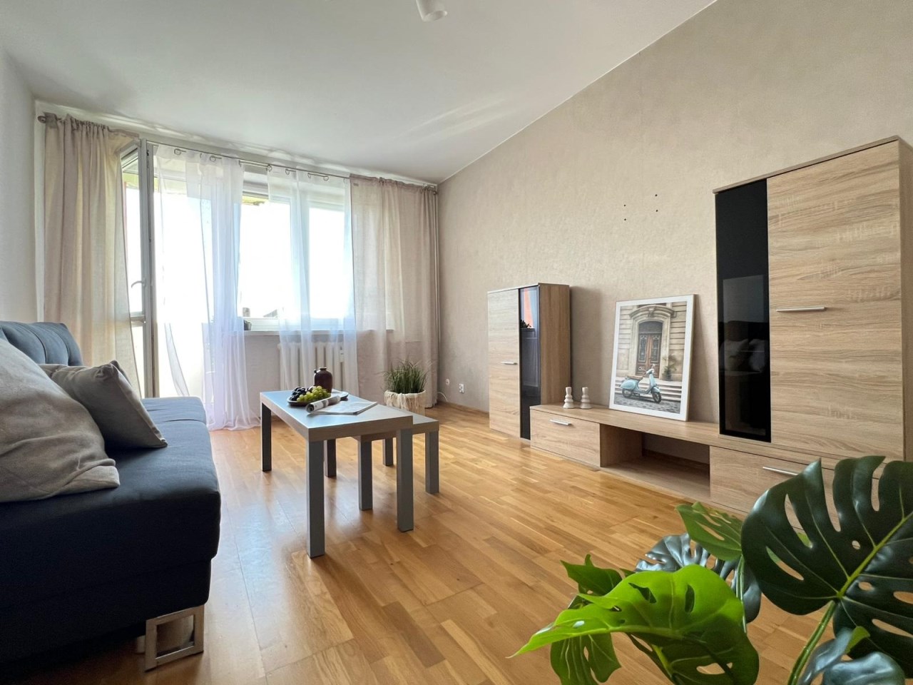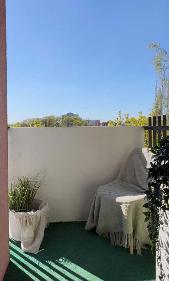 Salon jest jasny i przytulny, z wyjściem na balkon, który stanowi jeden z największych atutów mieszkania. Rozpościera się z niego widok na zieleń, bez bezpośredniego sąsiedztwa innych budynków, co daje poczucie prywatności, ciszy i spokoju – idealne miejsce na chwilę oddechu po dniu pracy.