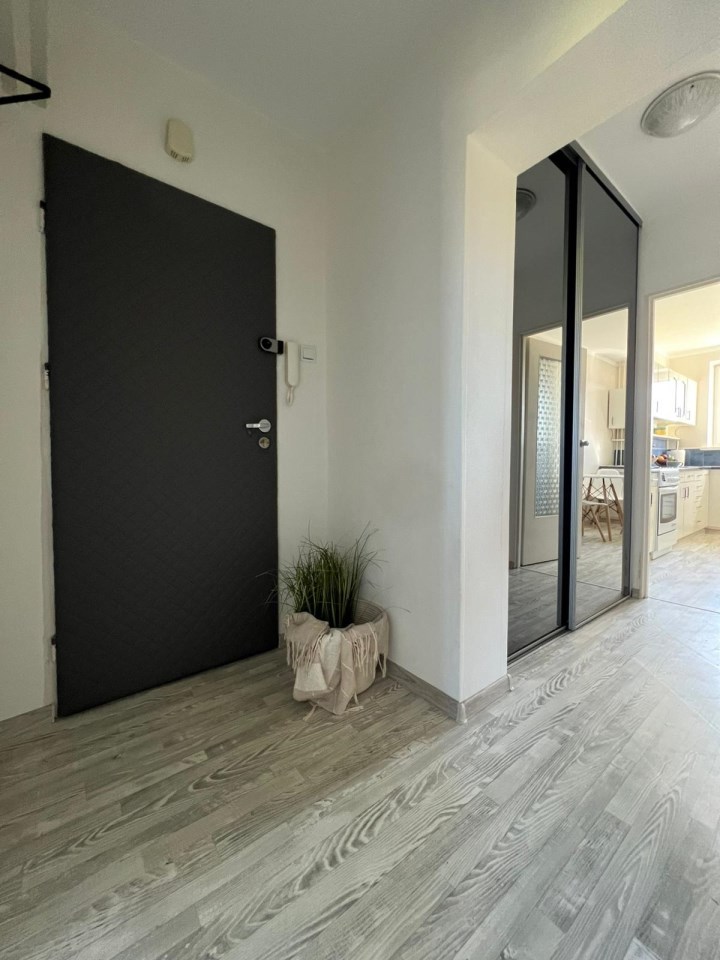 Przedpokój wyposażony jest w obszerną szafę w zabudowie z lustrami, oferując dużo miejsca do przechowywania i optycznie powiększając przestrzeń.