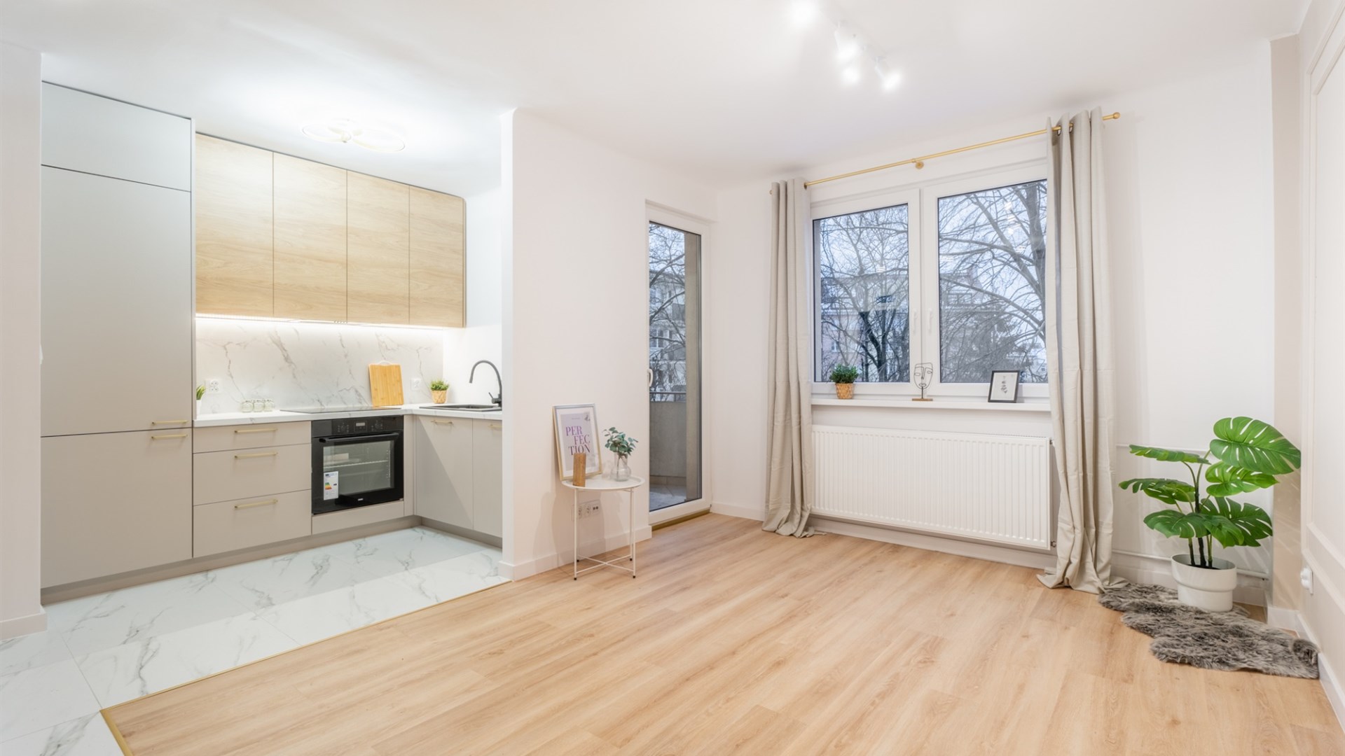 Kuchnia w pełni wyposażona w nowe sprzęty AGD, dobrze doświetlona ze względu na ekspozycję okien,