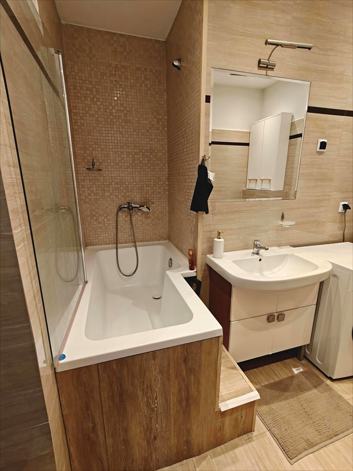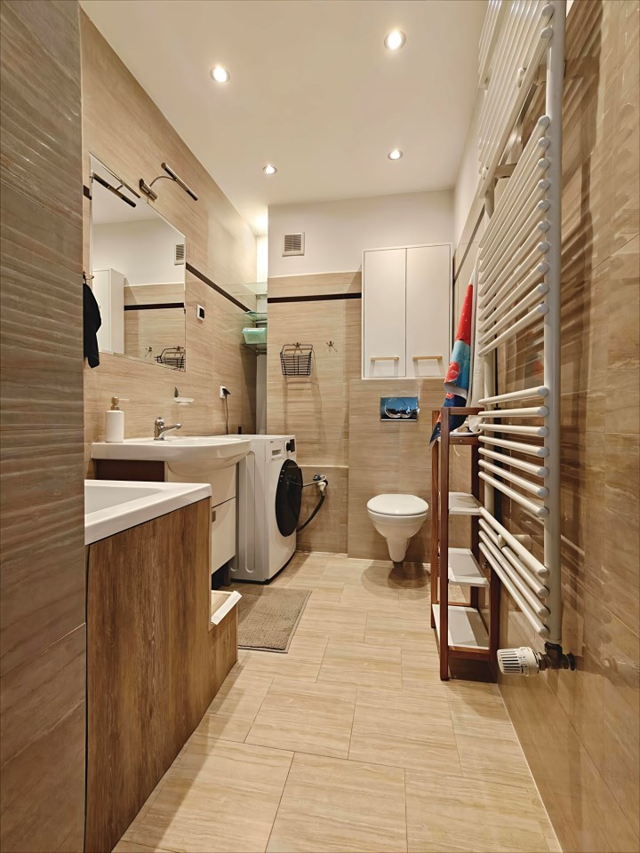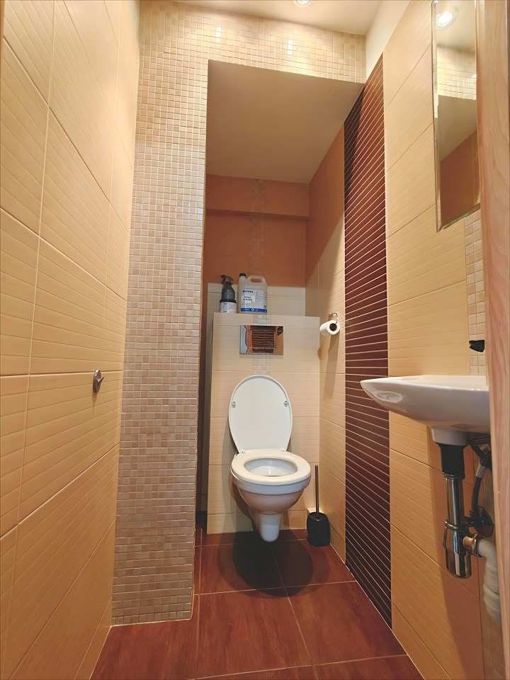Na tym poziomie mieści się również osobne WC, co znacząco podnosi wygodę użytkowania mieszkania.