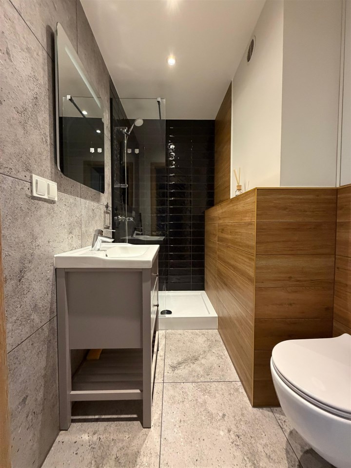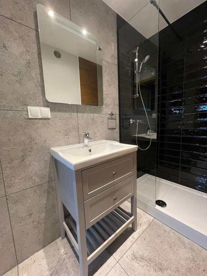 Jest duża szafa, szafka rtv, kanapa rozkładana z miejscem na pościel, kuchnia w zabudowie (płyta indukcyjna, piekarnik, zmywarka, pralka), w łazience dodatkowa szafka.
