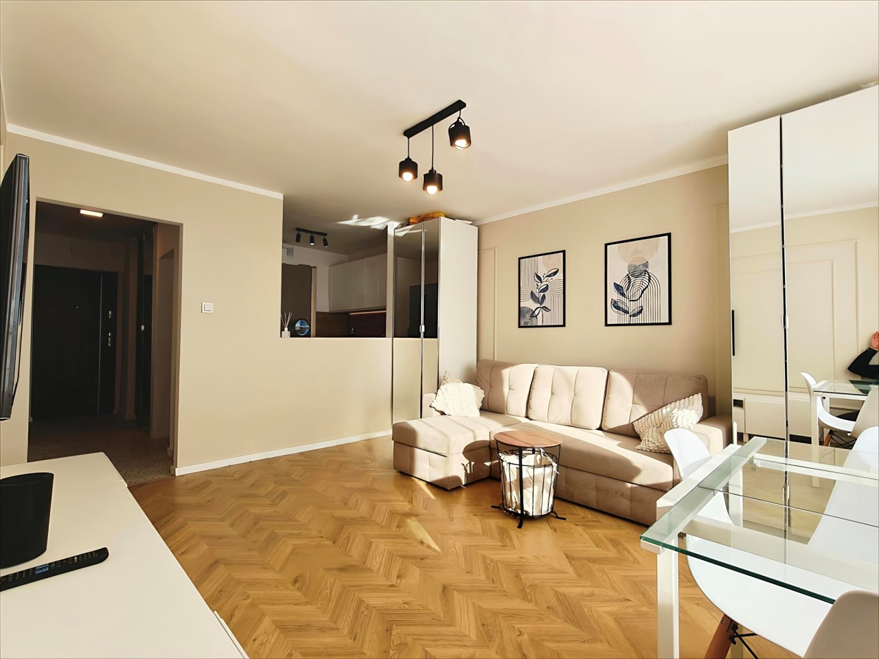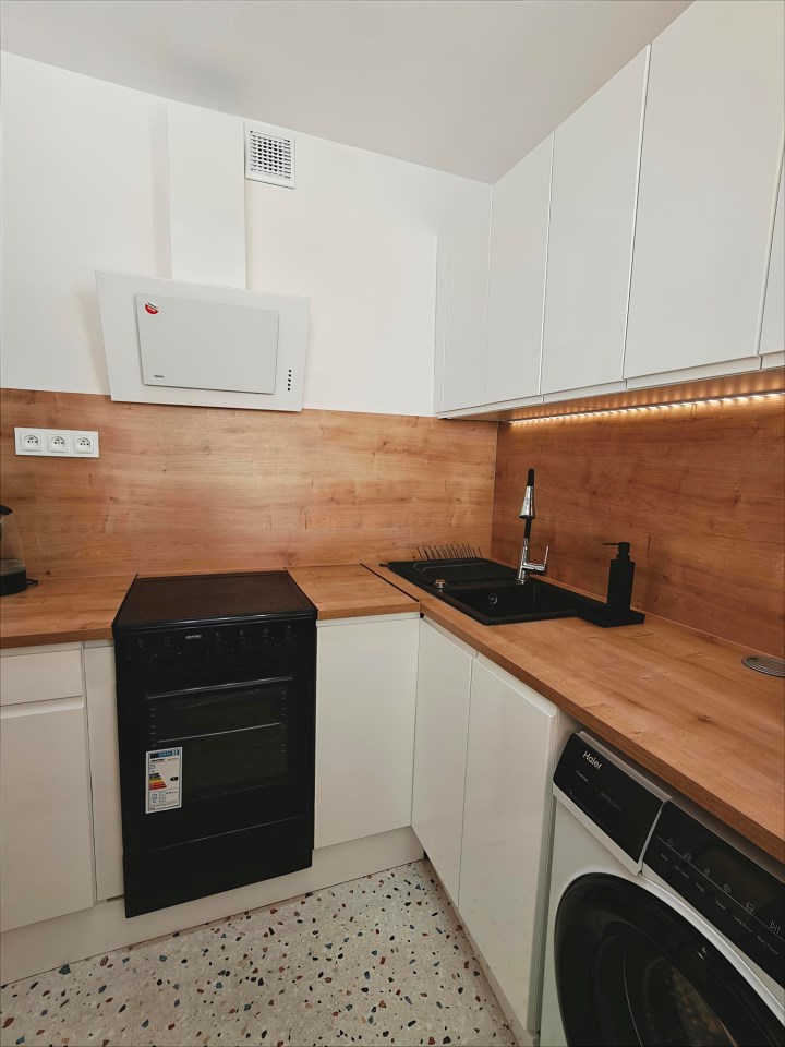 Przemyślany układ pomieszczeń obejmuje oddzielną kuchnię oraz komfortową przestrzeń dzienną, co czyni mieszkanie idealnym wyborem dla jednej osoby lub pary.