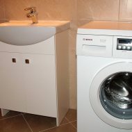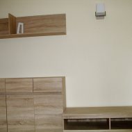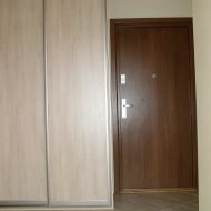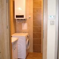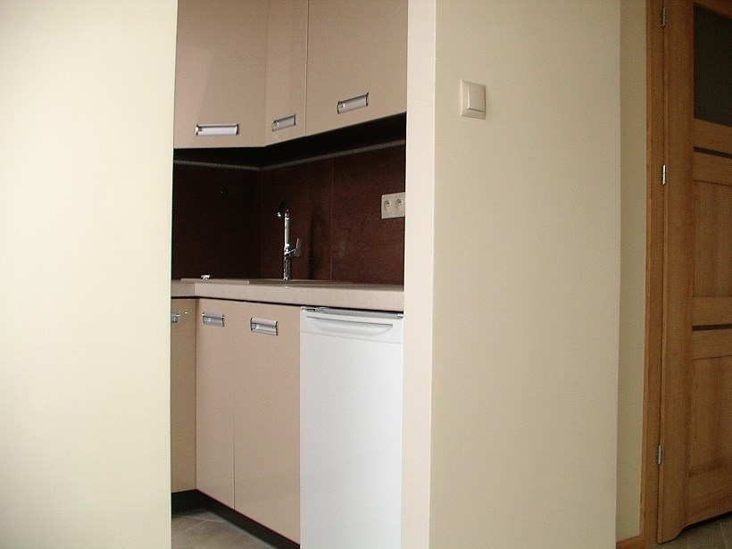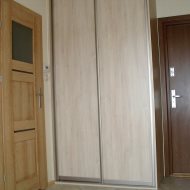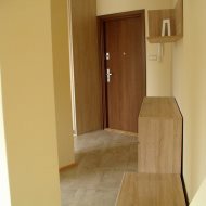Łazienka z kabiną natryskową sedesem, umywalką, pralką. Kuchnia wyposażona w zabudowę na wymiar i sprzęt AGD w zabudowie. W pokoju kanapa rozkładana i szafki. W przedpokoju szafa w zabudowie. Drzwi antywłamaniowe, ogrzewanie gazowe z pieca dwuobiegowego. Podłogi są w całym mieszkaniu z terakoty.