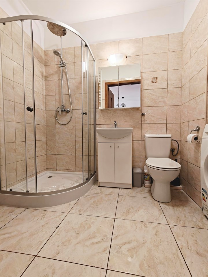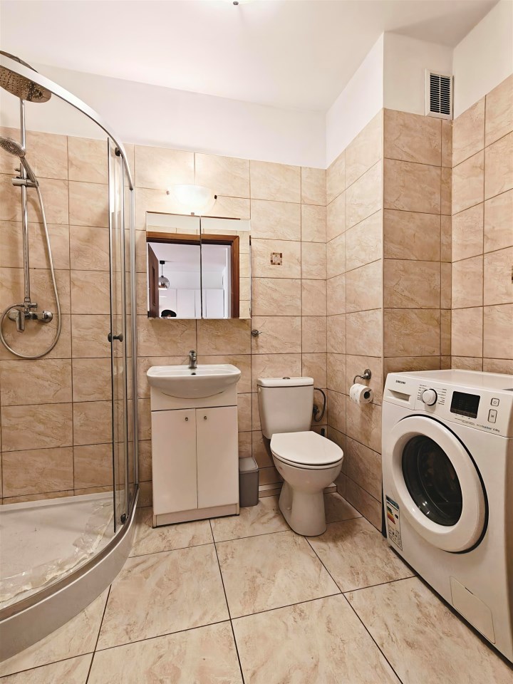 | Wyposażenie łazienki | kabina prysznicowa, lustro, pralka, umywalka na szafce, WC |