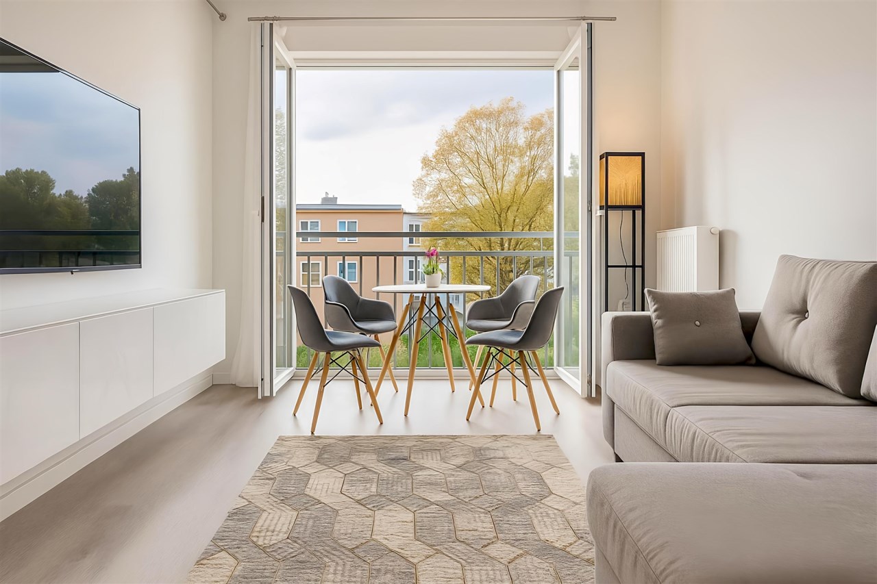 Salon: rozkładana sofa, telewizor, wyjście na balkon z widokiem na zadbane podwórze,