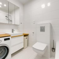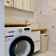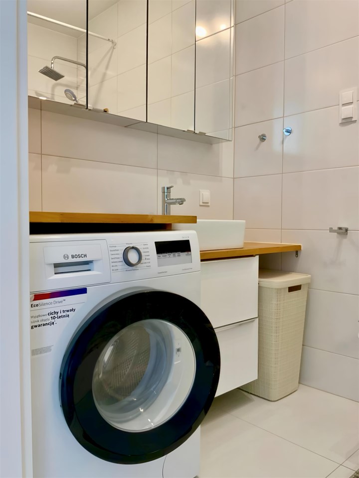 Łazienka: wanna, pralka, eleganckie kafle i armatura wysokiej klasy.