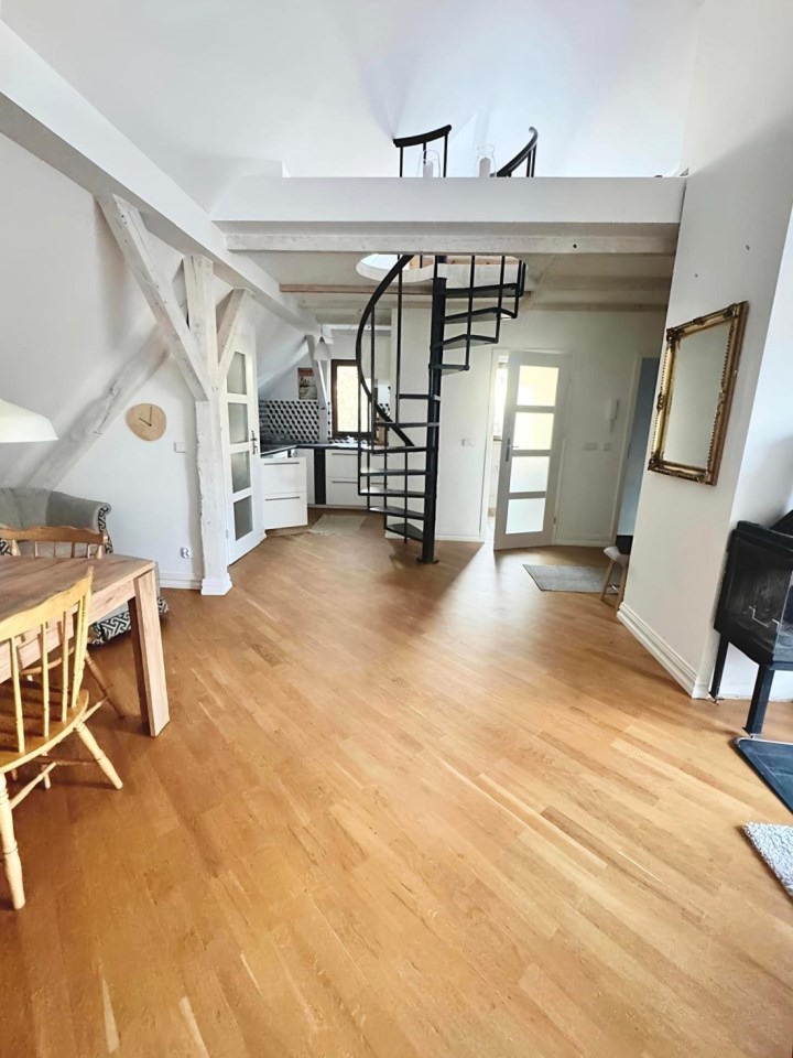 Lokal oferuje 52 m² powierzchni po podłodze, co przekłada się na funkcjonalną przestrzeń mieszkalną z charakterystycznymi skosami, nadającymi wnętrzu niepowtarzalny klimat. Dodatkowym atutem jest antresola o powierzchni ok. 10 m², idealna jako sypialnia, strefa relaksu lub miejsce do pracy.
