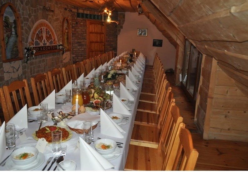 Budynek zbudowany z bali sosnowych, parterowy z użytkowym poddaszem i około 200m2 tarasem gastronomicznym.